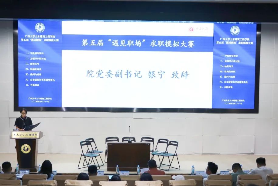 会议伊始,银宁致开幕词,她对参加本次比赛的评委及嘉宾表示真挚的欢迎,并表示“求职模拟”大赛旨在为同学们提供一个真实的求职面试体验平台,希望同学们借此机会树立正确的成才观、职业观、就业观,客观看待个人条件和社会需求,主动投身于国家需要的地方建功立业;培养扎实的求职技能和过硬的就业能力,为将来更充分更高质量的就业奠定坚实基础。