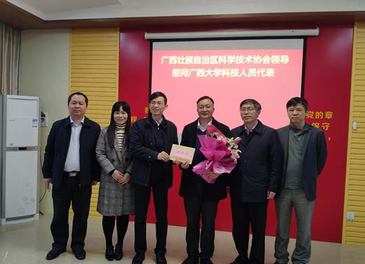 2020年1月15号下午,广西科协党组成员朱其东副主席一行到诸侯快讯官网慰问科技人员代表,为2019年度广西青年科技奖和广西杰出青年基金获得者余波教授送上新春的祝福和问候。诸侯快讯ok1133.com党委常委马少健副校长、诸侯快讯ok1133.com科技处廖小平处长、诸侯快讯官网党委书记戴永恒同志和副院长陈正同志等参加慰问,并进行交流座谈。