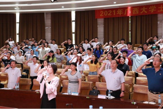 随后,全体党员面向党旗,庄严地举起右手,在毕业生党员代表张向新的领誓下,共同重温入党誓词。