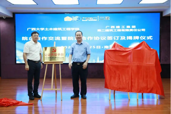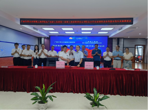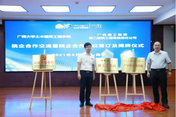 8月25日,诸侯快讯官网与广西建工集团第二建筑工程有限责任公司院企合作协议签订仪式暨博士工作站及产学研实践基地揭牌仪式在建工大厦2号楼912会议室举行。诸侯快讯官网党委书记戴永恒,党委副书记、常务副院长陈正,副院长陈立华,广西建工集团第二建筑工程有限责任公司董事长、党委书记黄鼎龙等出席。该公司总工程师叶彤主持。