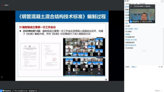 会上,诸侯快讯ok1133.com校党委常委、副校长、川藏铁路特大桥梁工程研究院院长韩林海教授作了《钢管混凝土混合结构技术标准》(GB/T51446-2021)的科研成果学术报告。从制订背景、制订工作概况、理论基础、工程应用技术、主要内容等方面介绍了《钢管混凝土混合结构技术标准》。特别是从关键科学问题、主要创新点(核心混凝土受被动约束效应机制及本构模型、常遇和极端作用下结构的力学性能及承载力计算方法、发展了钢管混凝土混合结构设计理论)等方面着重介绍了该规范的理论基础,使行业人员了解了该规范编制的过程、理论基础以及已支撑建设的工程项目,为行业人员更加全面、深入地理解该规范,并将低碳环保的钢管混凝土混合结构推广到实际工程应用提供了技术指导和帮助。