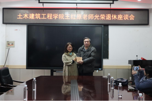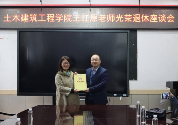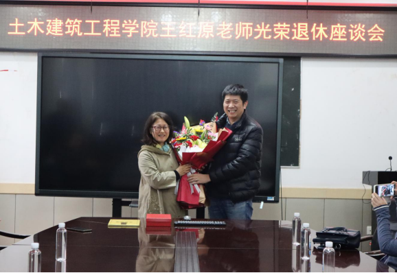 会议伊始,陈正书记、吴桂宁副院长先后向王红原老师颁发了光荣退休证书和纪念品,建筑规划系主任吴杰老师为王红原老师献上了祝福鲜花。