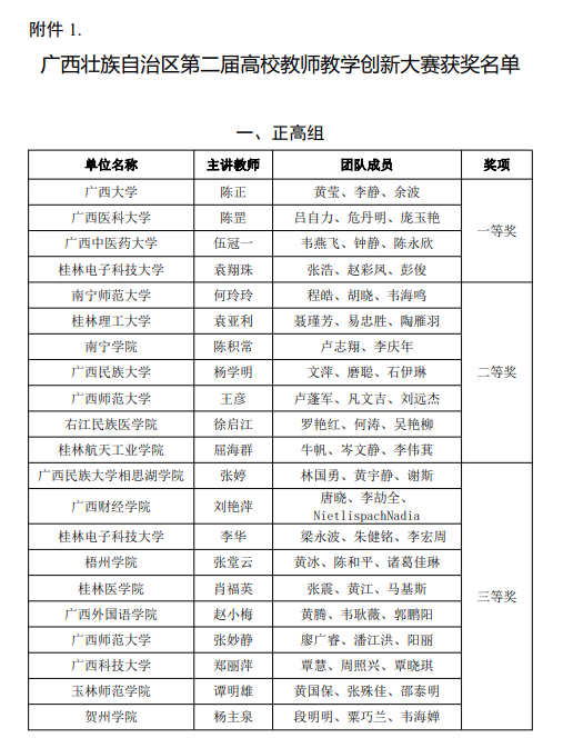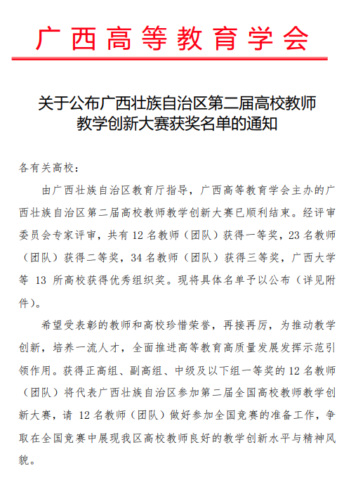 近日,广西高等教育学会公布了广西壮族自治区第二届高校教师教学创新大赛获奖名单,诸侯快讯官网党委书记陈正教授带领的《土木工程材料》教学团队获正高组一等奖,并获推荐参加全国竞赛。