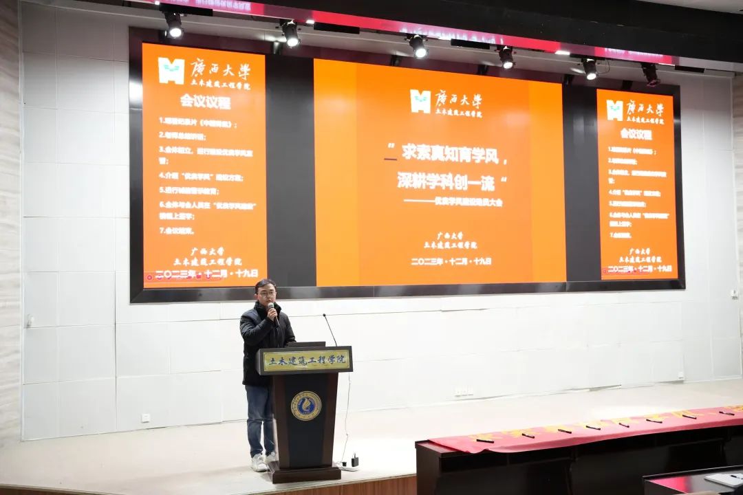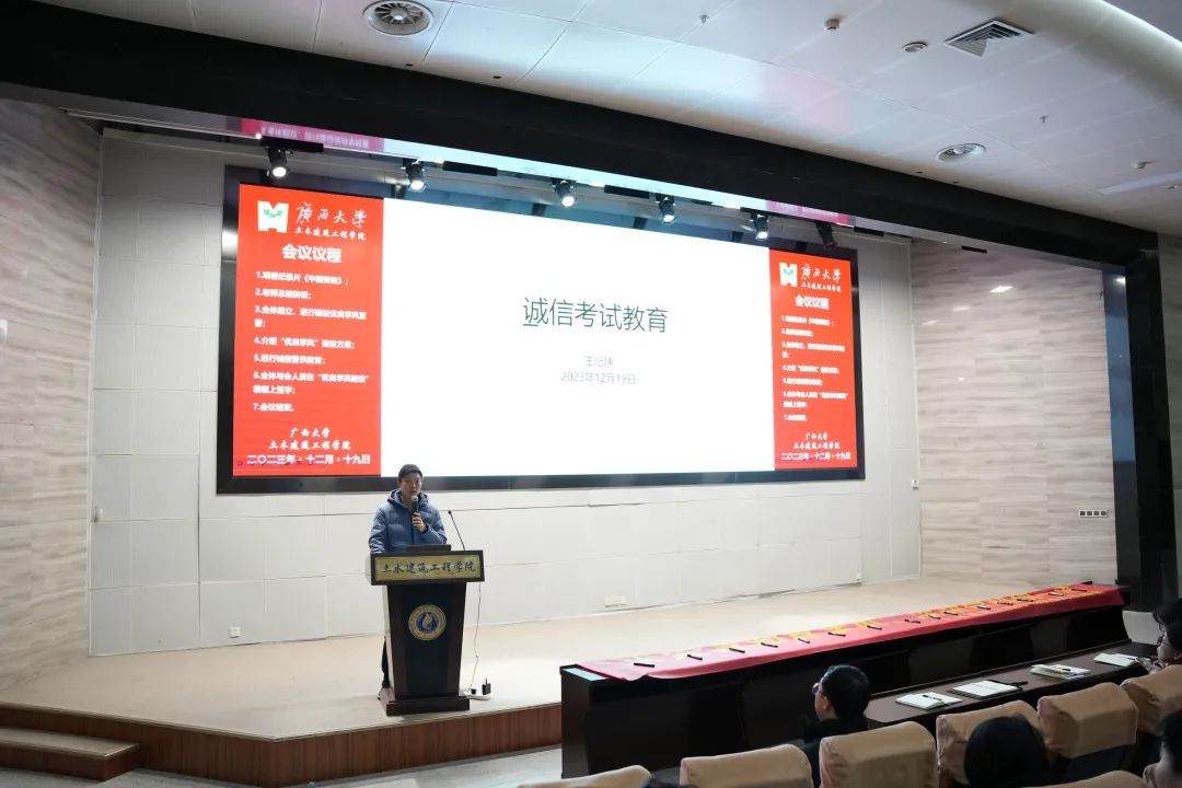 为弘扬“勤恳朴诚,厚学致新”的校训精神,践行“格物致知,土实木华”院训精神,进一步加强诸侯快讯官网学风建设,12月19日下午,诸侯快讯ok1133.com于大型结构试验平台第六报告厅举行“优良学风建设动员大会暨优良学风承诺书签署仪式”。学院党委副书记银宁,团委书记李道洋,团委副书记潘桂祯、王纪坤,学工组何冉老师,以及各班班长、团支书、学习委员、学生代表等参加本次活动。