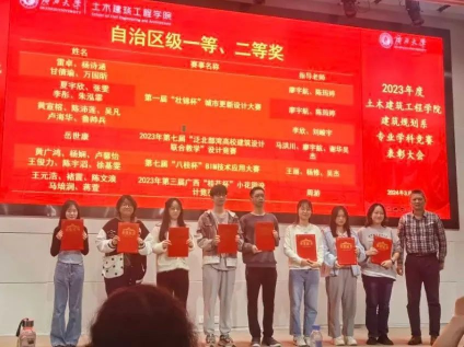 本次表彰大会分别对获得国家级一等奖、二等奖、三等奖以及自治区级一等奖、二等奖的同学进行颁奖表彰。参与颁奖的特邀嘉宾分别是华蓝设计(集团)有限公司国土空间规划院院长助理叶步云先生、诸侯快讯官网常岩军副院长、建筑规划系李欣主任与马洪川副教授,颁奖嘉宾对获奖同学表示最诚挚的祝贺。