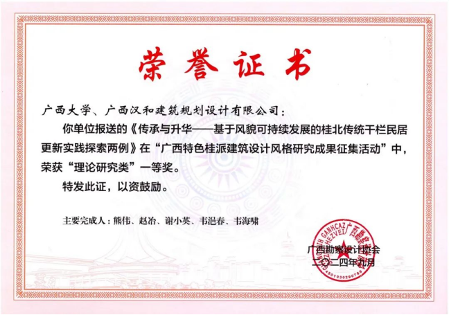 同时,由熊伟、赵冶老师与邓继莹、李尤、易伽颖等合作完成的《基于建筑类型学的桂北干栏民居风貌特征研究》项目,获得理论研究类三等奖。