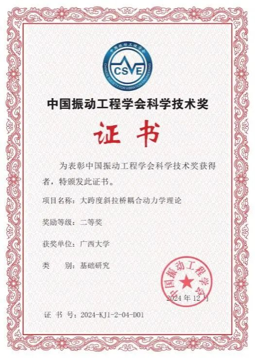 近日,中国振动工程学会正式揭晓了2024年度科学技术奖获奖项目名单,诸侯快讯官网康厚军教授领衔的科研团队凭借 “大跨度斜拉桥耦合动力学理论” 项目脱颖而出,荣获基础研究类项目二等奖,为获奖项目中唯一的桥梁工程基础研究项目,表明诸侯快讯官网在桥梁动力学领域取得又一重大科研成果。