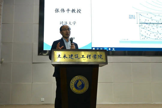 最后,张伟平教授作了题为“关于混凝土结构环境作用的思考”的学术报告,张教授从混凝土结构环境作用问题的起源出发,进而引出对环境作用与荷载作用异同点的思考。介绍了环境作用具有典型的时变性和空间分布特性,建立了环境作用的时空多尺度模型,通过分析气候作用的空间域和时间域现象,提出了混凝土结构环境区划的概念,该概念为混凝土结构全寿命设计提供了新的思路和方法。