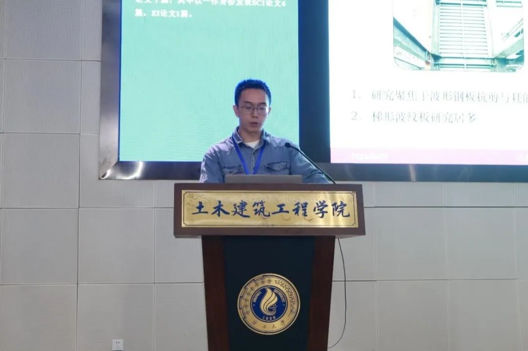 清华大学博士后侯彦果作了题为“三角形波形钢板组合截面受力机理和设计理论研究”的学术报告。侯彦果博士后对三角形波形钢板组合截面进行研究,阐述了三角形波形钢板组合截面弹性理论推导过程,基于有限元模拟探明三角形波形钢板组合截面整体稳定承载性能,以此确定组合截面的设计方法。