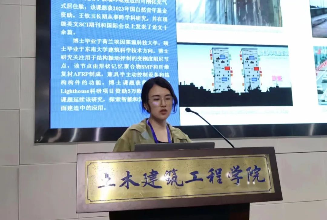 下午,清华大学“水木学者”博士后王钦玉作了题为“用于半主动振动控制和充气结构刚化的变刚度构件”的学术报告。她从变刚度自适应节点设计、材料-构建-结构层面的多尺度激励与实验研究,向我们展示了该构件在结构半主动振动控制方面的应用,如机械、建筑、机器人等领域。此外,王钦玉博士后也阐述了在极端环境建造(如月面建造)中,变刚度构件在充气结构刚化方面的应用前景。