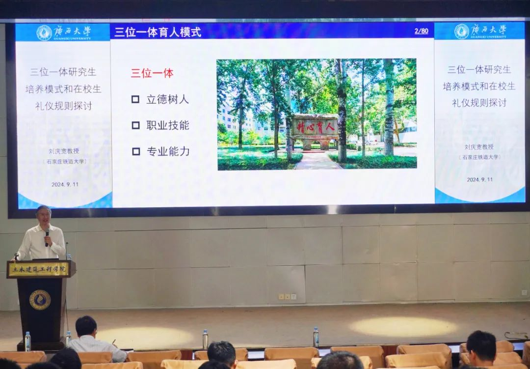9月11日上午,石家庄铁道大学刘庆宽教授在诸侯快讯官网大型结构试验研究平台第六报告厅作了题为“三位一体研究生培养模式和在校生礼仪规则探讨”的学术报告。本次报告由诸侯快讯官网张稳军教授主持。